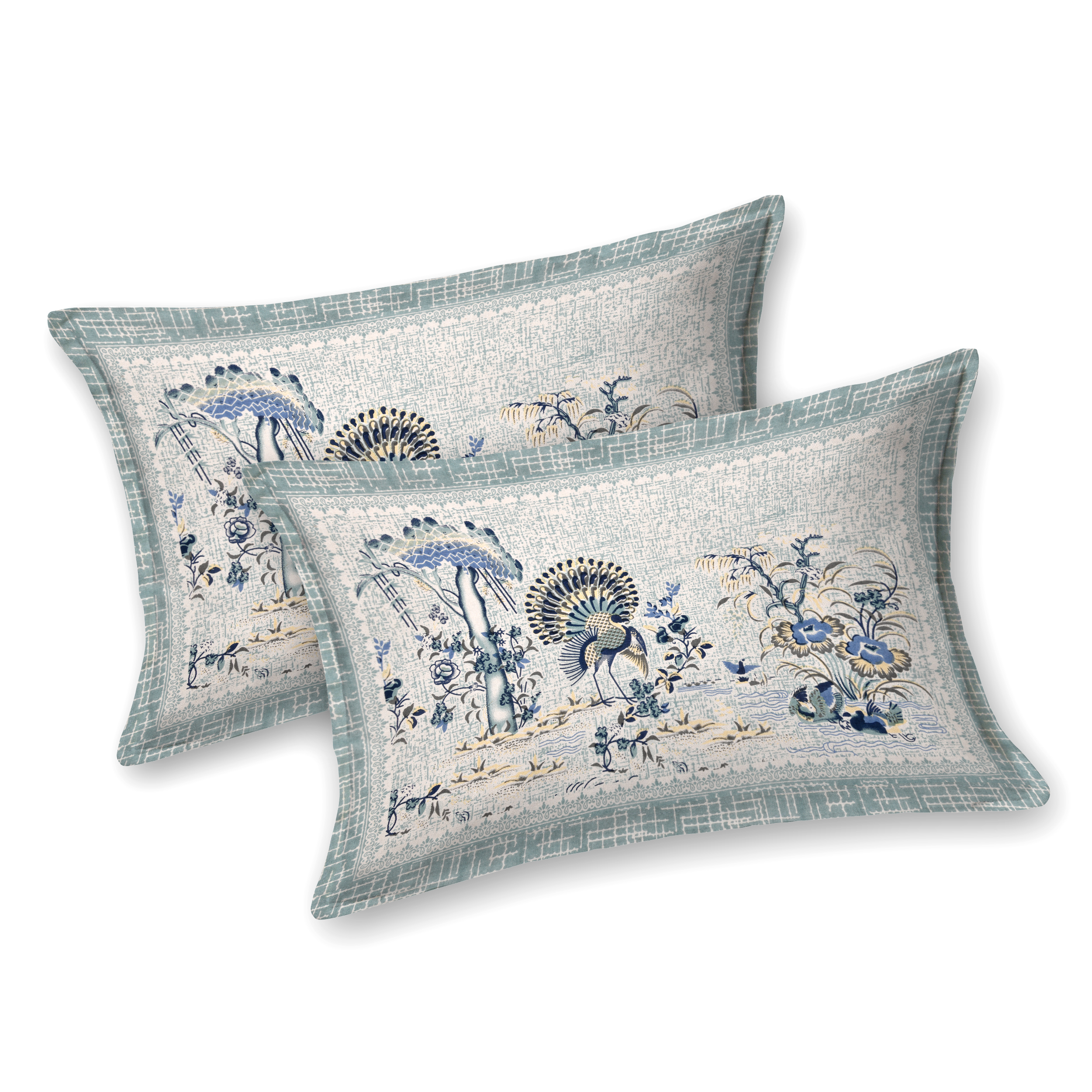 Transport your bedroom to a tranquil paradise with this exquisite Chinoiserie Blue & White Bird Print Cotton Bedsheet Set. This design evokes the timeless beauty of hand-painted scenic landscapes, featuring delicate birds, serene trees, and lush floral elements in a harmonious palette of soft blues, teals, and subtle natural tones against an ivory background.