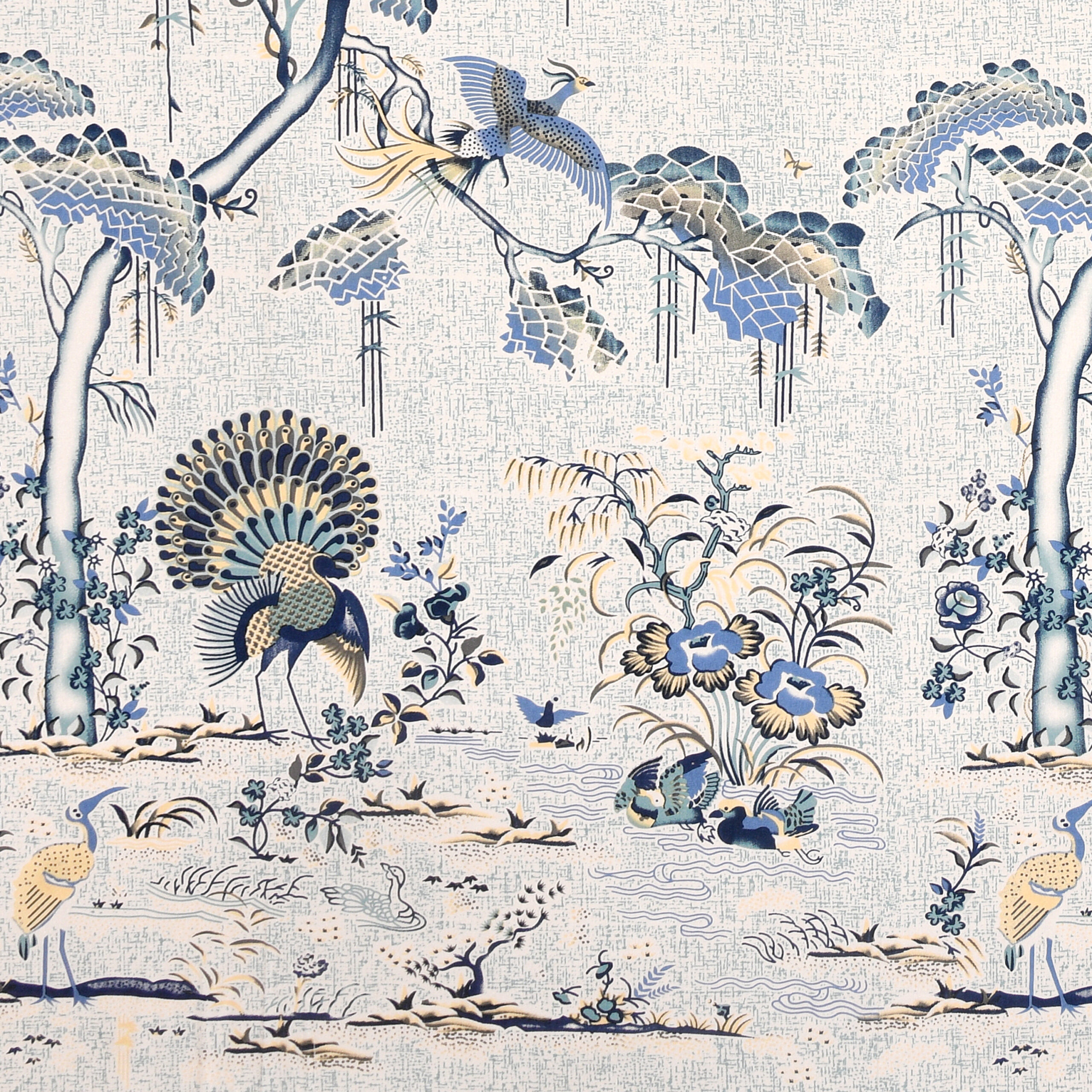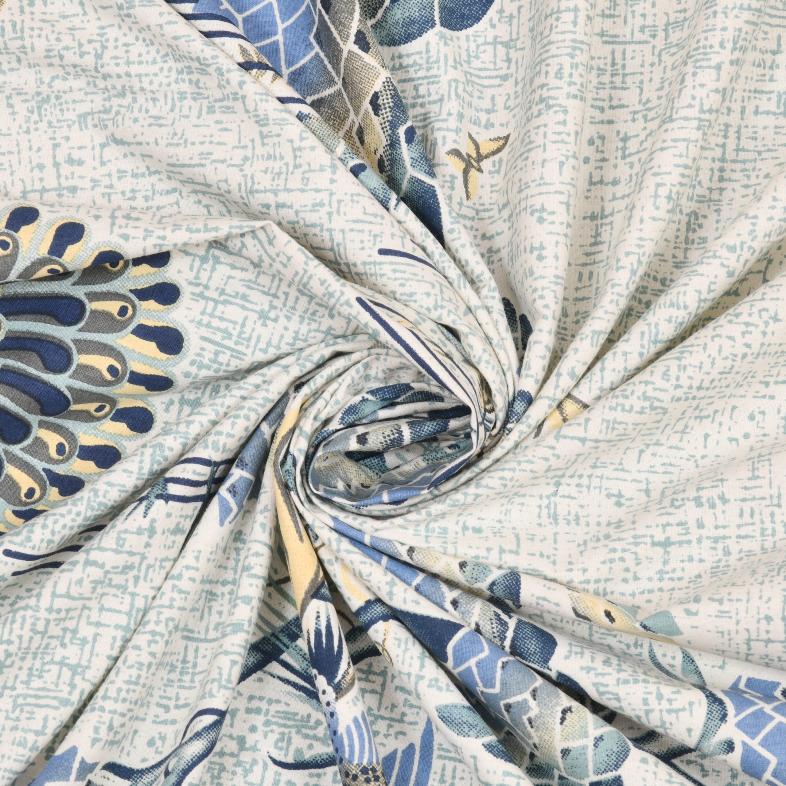- Artistic Chinoiserie Print: The bedsheet features a stunning, expansive scenic print along the bottom half, depicting elegant birds (like herons or peacocks), stylized trees, and blooming flowers in a classic Chinoiserie or Jaipuri style.